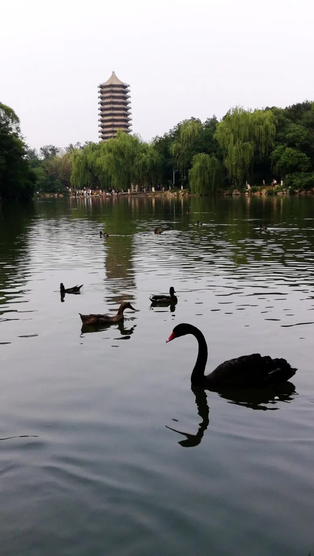 未名湖飞来美丽的黑天鹅