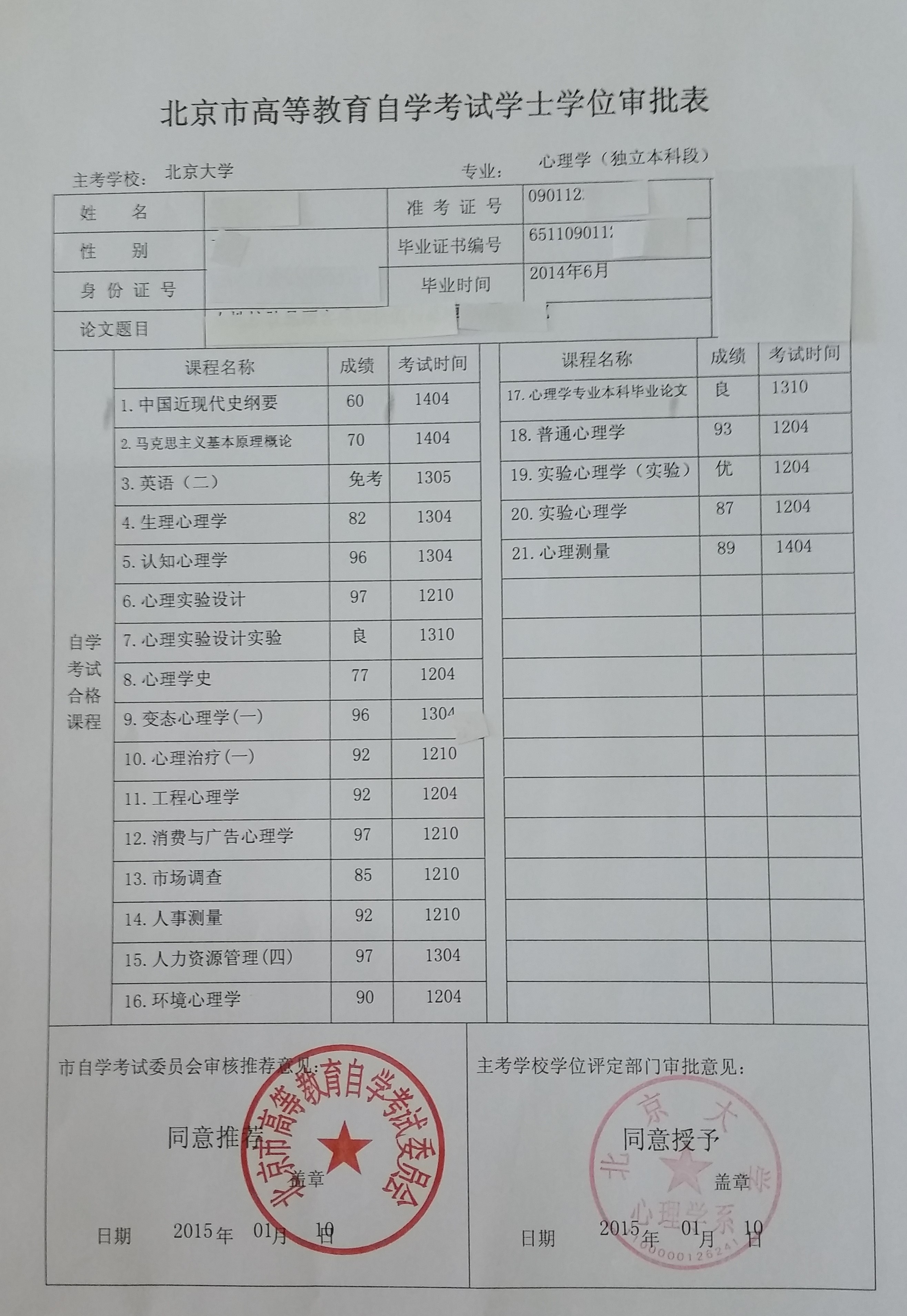 国家承认学历的毕业证书,本科毕业可获得北京大学理学学士学位。 说 明:1.心理学本科自学考试为独立本科,自2015年4月考试非心理学专业专科、本科生可报考心理学独立本科段学习,需要加考专科段普通心理学和社会心理学课程。